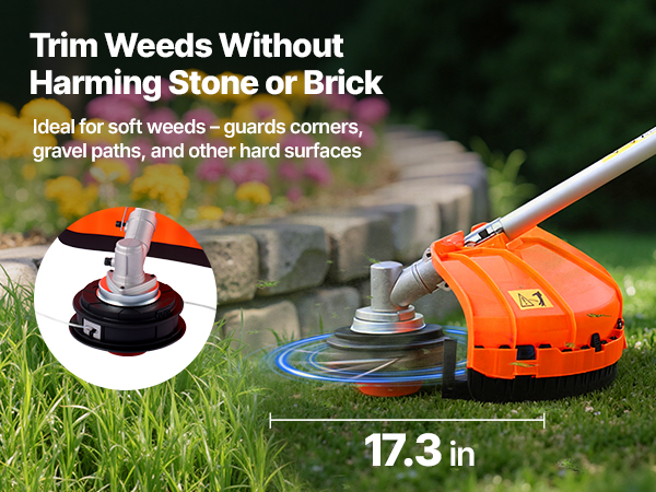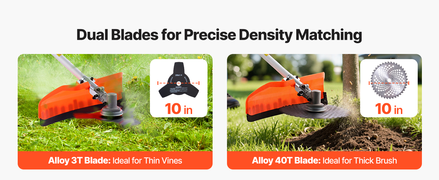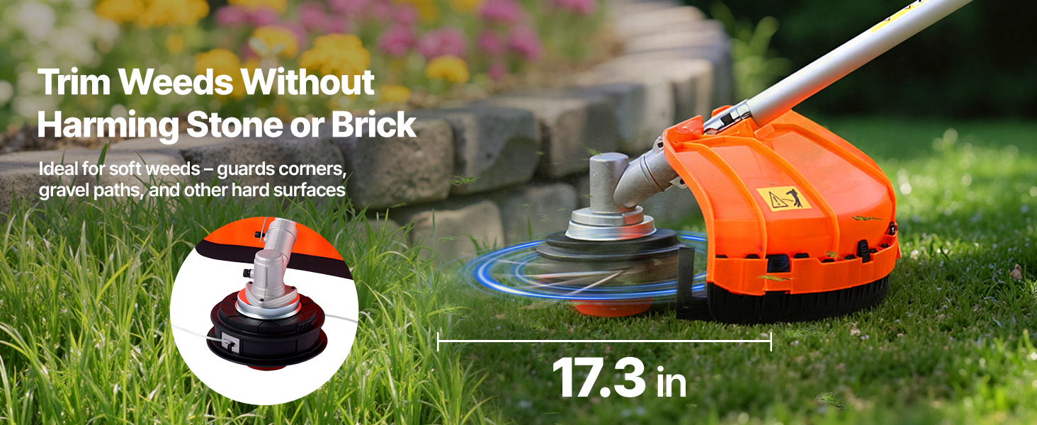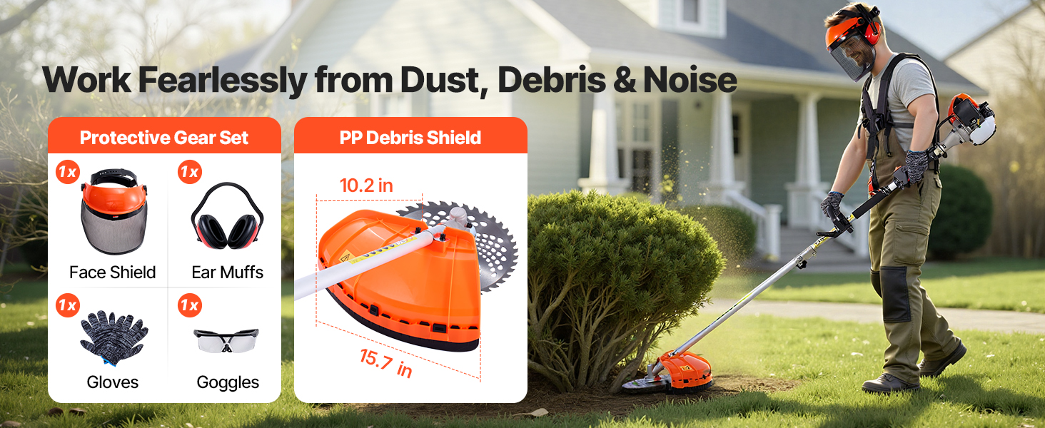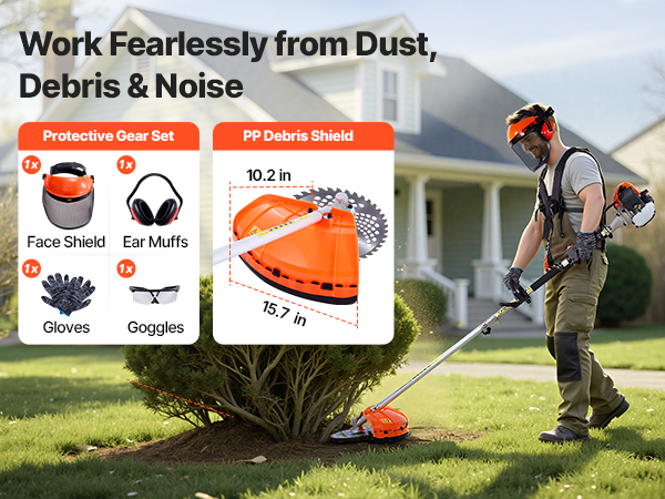 • Safety & Comfort: The bush trimmer includes a PP deflector and protective gear kit (face shield, safety glasses, earmuffs, gloves) to safeguard against flying debris and noise. Dual shoulder straps and rubberized handle minimize fatigue during extended use.