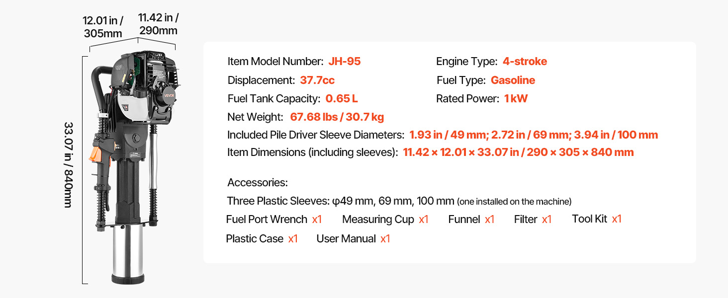 - Powerful 4-Stroke Engine: Our post driver is built with a sturdy aluminum alloy engine that delivers 1000W of power, running at 6500 RPM. Provides smooth operation with high fuel efficiency and low vibration for optimal piling performance