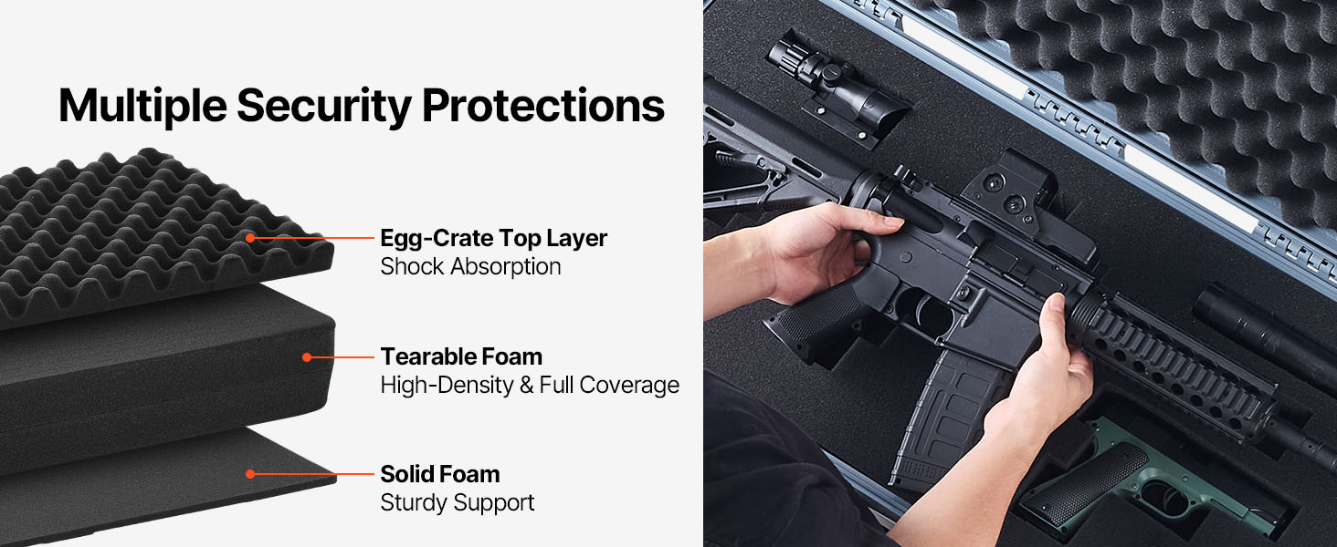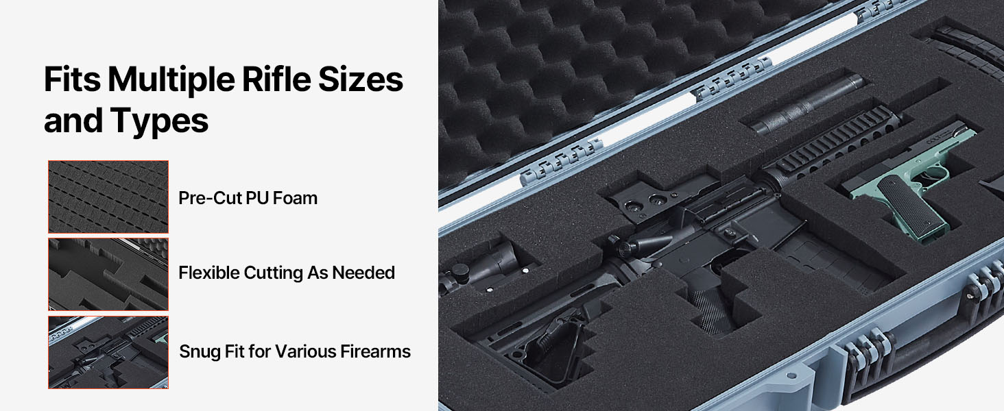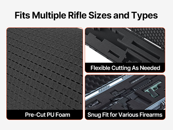 - 4-Layer Foam: Our gun case features 4 layers of soft foam:1 layer of egg-crate foam for shock absorption; 2 layers of pre-cut foam for a snug fit; 1 layer of solid foam for extra support. You can customize compartments tailored to the shapes of your rifle