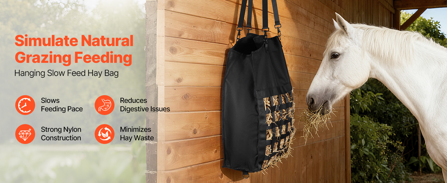 This hanging slow-feed hay bag controls feeding pace, reduces hay waste, and allows animals to feed naturally all day without supervision. It saves time and labor while ensuring a low-waste, hassle-free, and highly efficient feeding routine.