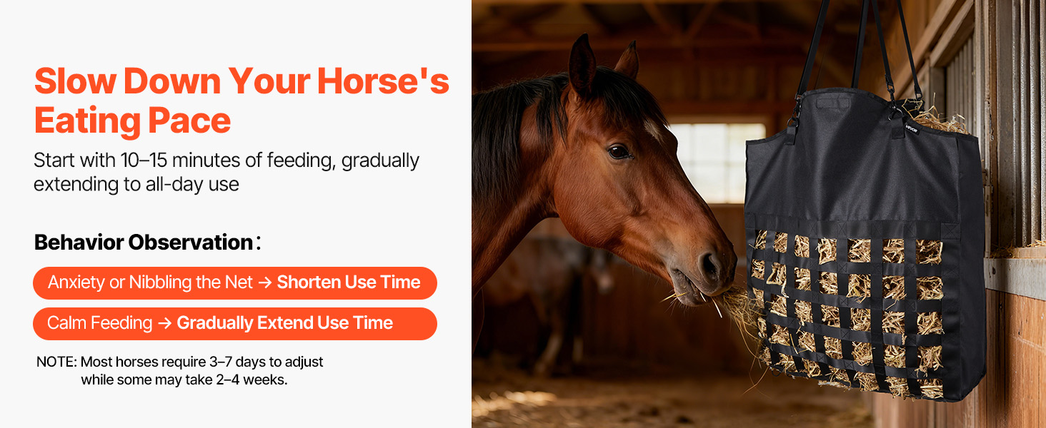 Choose mesh size based on your horse’s breed, age, teeth, and feeding needs. Our horse hay bag mimics natural feeding and supports digestion, reducing trampling, over-pulling, and hay waste.