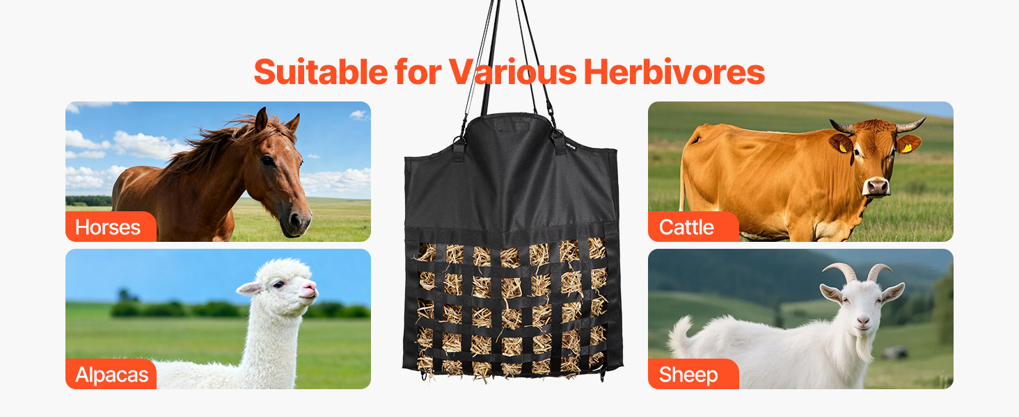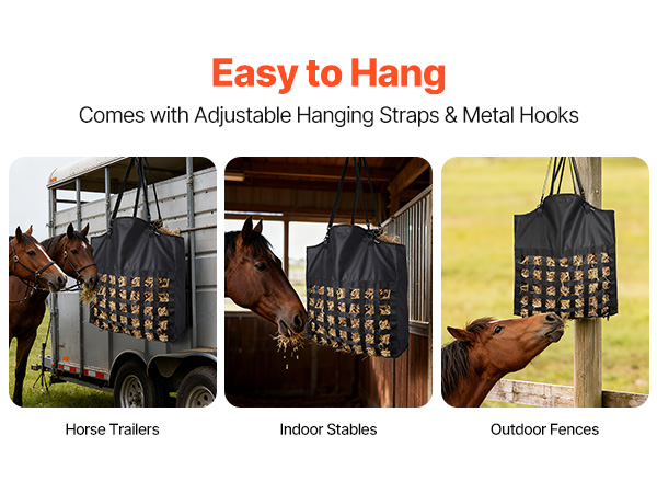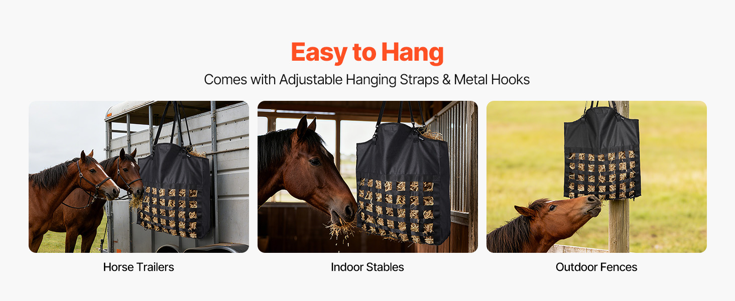 Suitable for indoor and outdoor use, this hay bag can be quickly and securely hung on fences, stables, or vehicles. Convenient and portable, it allows flexible feeding in various environments.