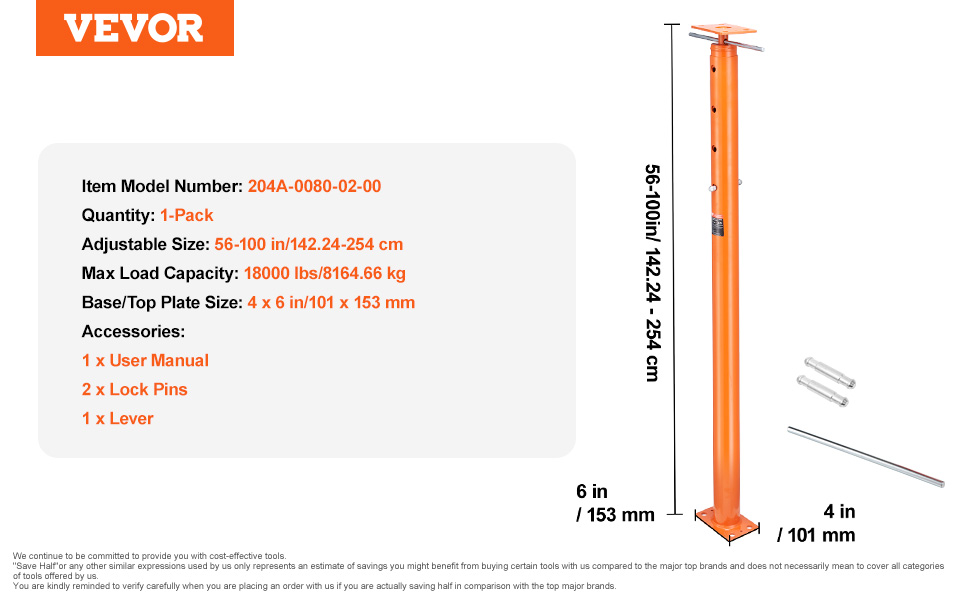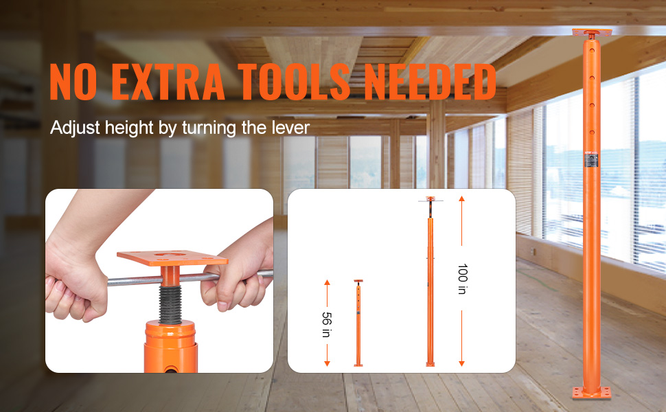 - Adjustable Height Design: Need flexibility? This basement floor jack features an adjustable height design. It adjusts from 56 to 100 in/142.24 to 254 cm, so you can find the perfect height for your needs.