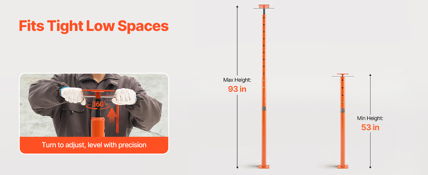 - Adjustable Height Design: Need flexibility? This house floor jack features an adjustable height design. It adjusts from 53 to 93 in/1346 to 2362 mm, so you can find the ideal height for your needs