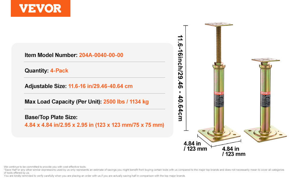 - Adjustable Height Design: Need flexibility? This basement floor jack features an adjustable height design. It adjusts from 11.6 to 16 in/29.46 to 40.64 cm, so you can find the perfect height for your needs.
