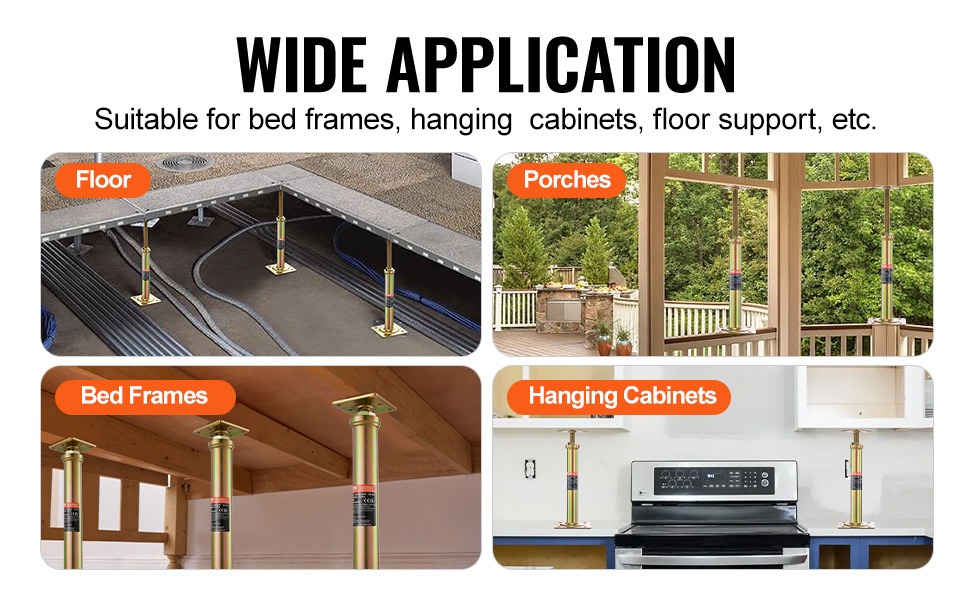 - Versatile Application: Our floor joist jack boosts an excellent load capacity and unique adjustable height design. Ideal for temporary support in various places like bed frames, cabinets, weak floors, and doorways—this jack does it all!