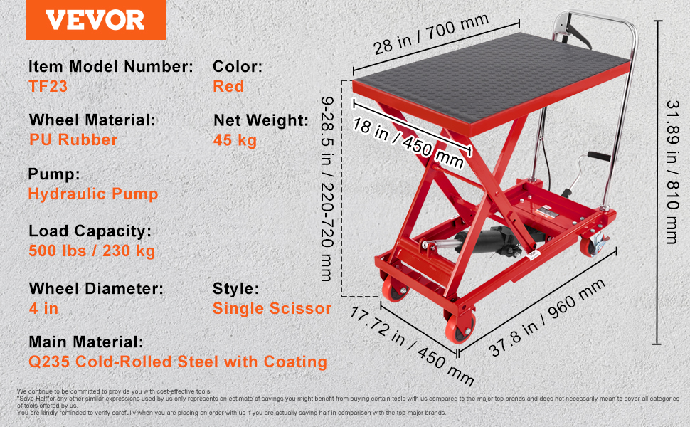 - 500 lbs Load Capacity: Tackle a variety of lifting tasks with confidence! Our red hydraulic scissor cart is designed to handle loads up to 500 lbs. The scissor and platform are made of premium thickened steel with a rust-resistant powder-coated surface. This ensures long-term durability and stability when handling heavy objects, making your work easy, efficient, and secure.
