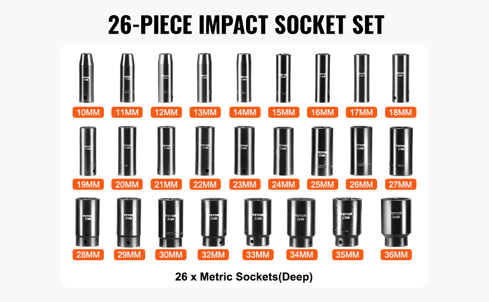• 【26 SOCKETS INCLUDED】- This effort-saving 1/2 inches drive impact socket set comes with 26 deep impact drive sockets: 10mm, 11mm, 12mm, 13mm, 14mm, 15mm, 16mm, 17mm, 18mm, 19mm, 20mm, 21mm, 22mm, 23mm, 24mm, 25mm, 26mm, 27mm, 28mm, 29mm, 30mm, 32mm, 33mm, 34mm, 35mm, 36mm.