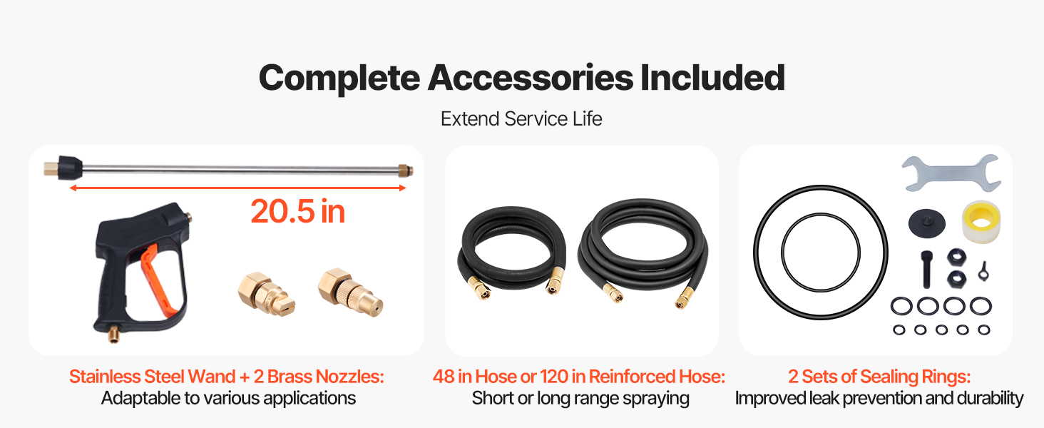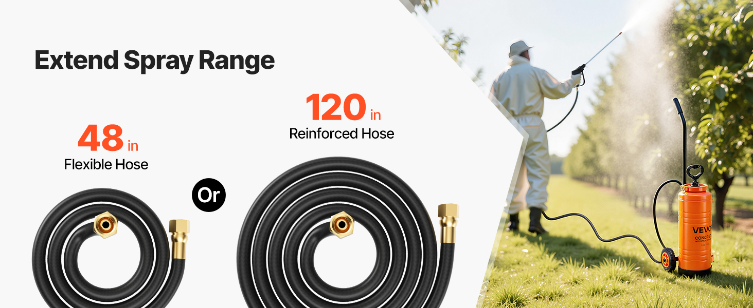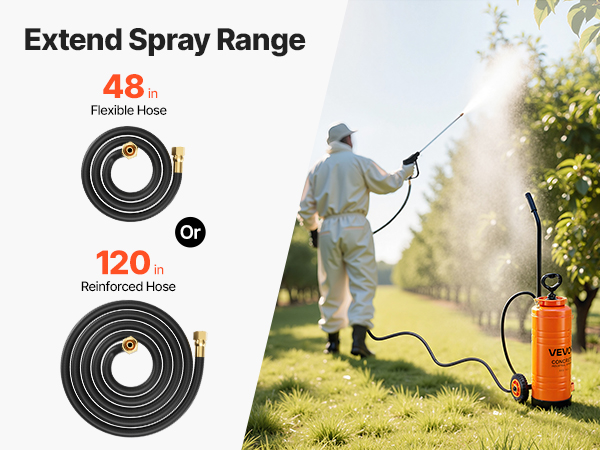 - Extended Hose for Wider Reach: Equipped with a 48-inch hose and a bonus 120-inch reinforced hose, our garden sprayer extends the spraying radius, eliminating the need to frequently move the unit, thus increasing work efficiency.