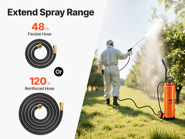 - Extended Hose for Wider Reach: Equipped with a 48-inch hose and a bonus 120-inch reinforced hose, our garden sprayer extends the spraying radius, eliminating the need to frequently move the unit, thus increasing work efficiency.