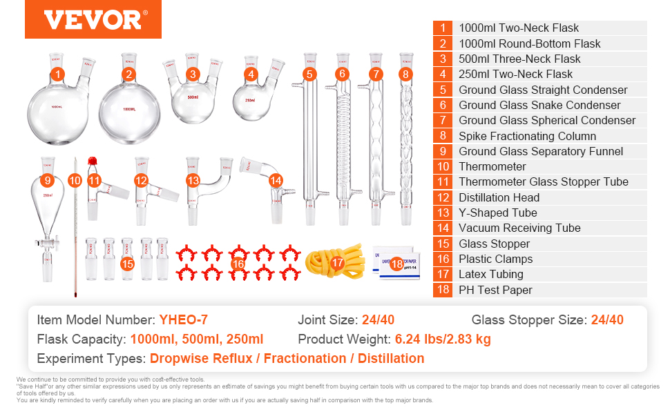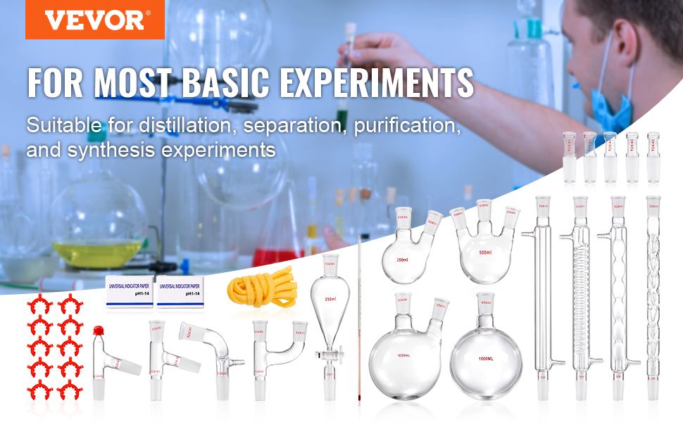 - Versatile Applications: VEVOR's professional distillation kit covers nearly all essential tools for laboratories, homes, research centers, and educational settings. Ideal for collecting essential oils, aqueous extracts, and distilled water.