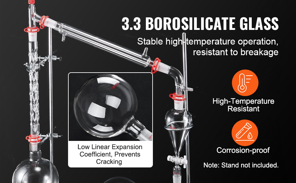 Elevate your essential oil extraction with VEVOR’s distillation apparatus. Crafted from durable 3.3 borosilicate glass, it ensures lasting durability and reliability. It also features high temperature and corrosion resistance, ensuring efficient experiments and confident results!
