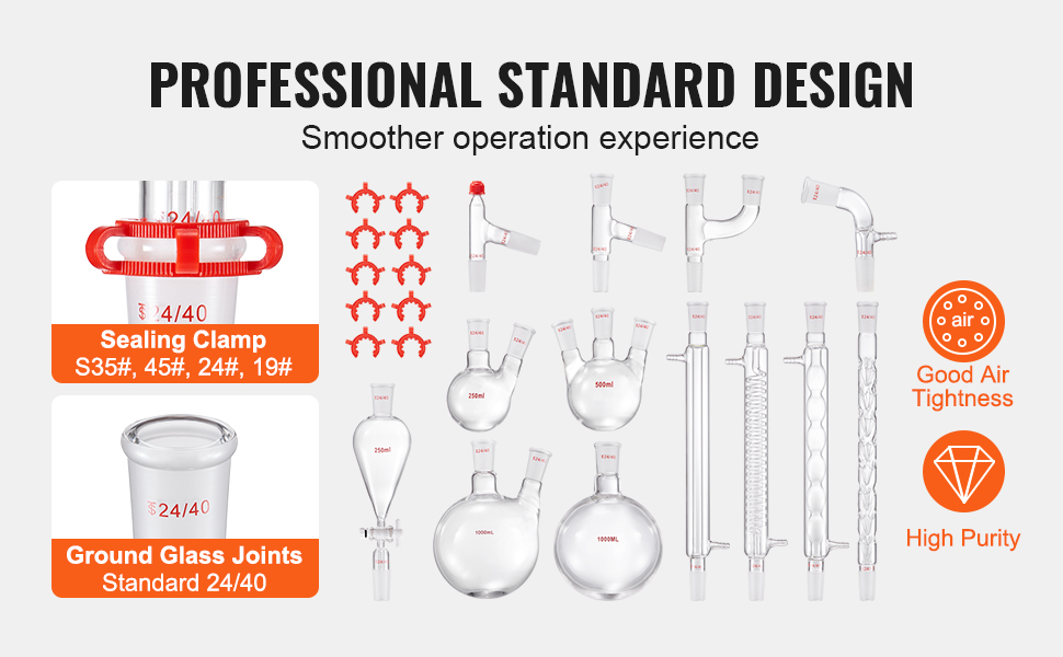 - Standard Ground Joints: All joints are in the standard 24/40 size, allowing easy replacement of different specifications' glassware. They are sandblasted to ensure airtightness and distillation purity.