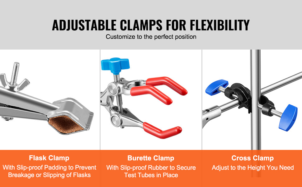 - Versatile Accessories: Adjustable clamps accommodate various test tube and flask sizes, providing flexible support for different laboratory equipment, catering to diverse experimental needs.