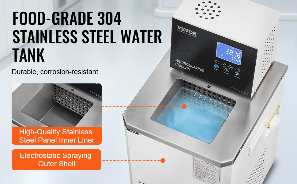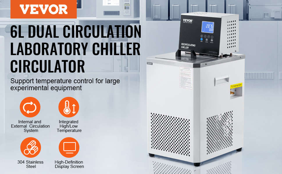 • High-Quality Compressor and Circulation Pump: The VEVOR laboratory chiller circulator features an efficient, fully enclosed compressor, compact structure, rapid cooling speed, and robust temperature stability for long-term constant-temperature operation. The quiet circulation water pump ensures low noise and smooth operation, maintaining stable water flow over extended periods.