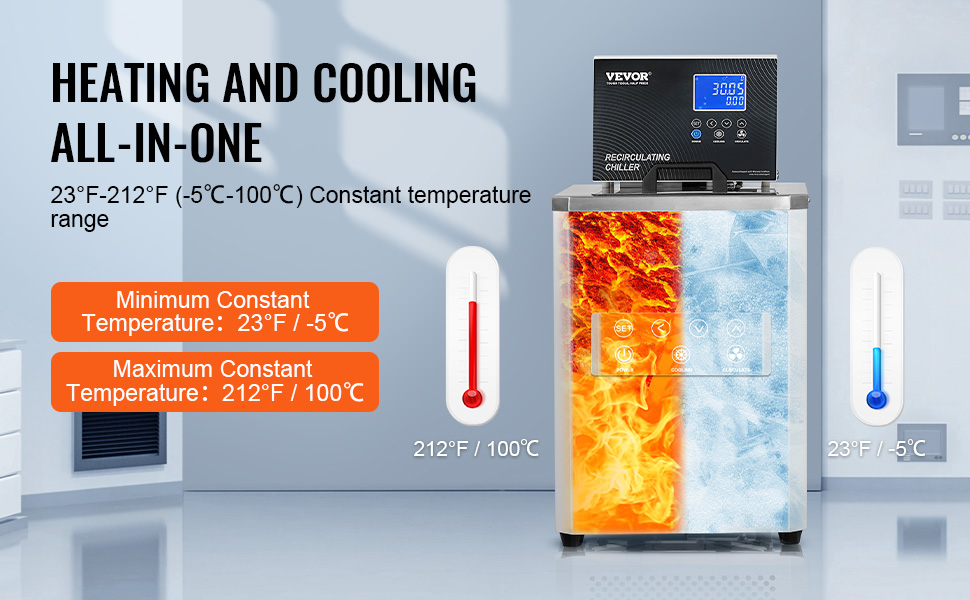 • Advanced Smart Control: Our circulator pump chiller features a high-definition LCD screen with 0.01℃ accuracy, a temperature range of -5℃ to 100℃ (23°F to 212°F), and a clear digital display for easy monitoring. It includes overheat and over-current protection, with alarms for overheating, ensuring a smart and comfortable user experience.