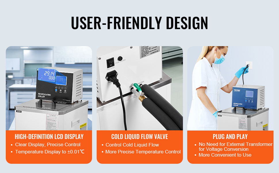 High-precision temperature display of ±0.01℃ ensures precise control over temperature and timing. Our circulator pump chiller is equipped with a cold liquid flow valve for precise control. Plug-and-play functionality without the need for external voltage transformers before use.