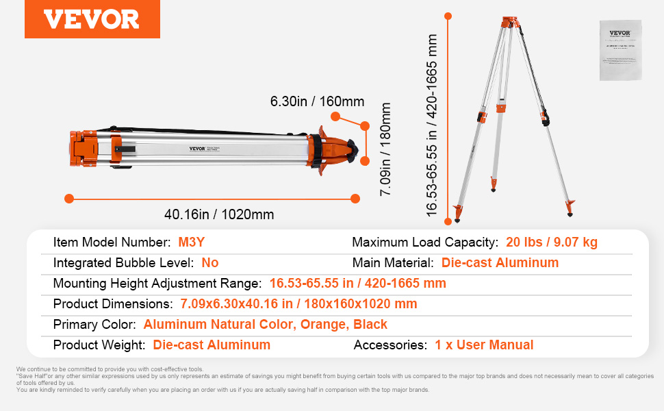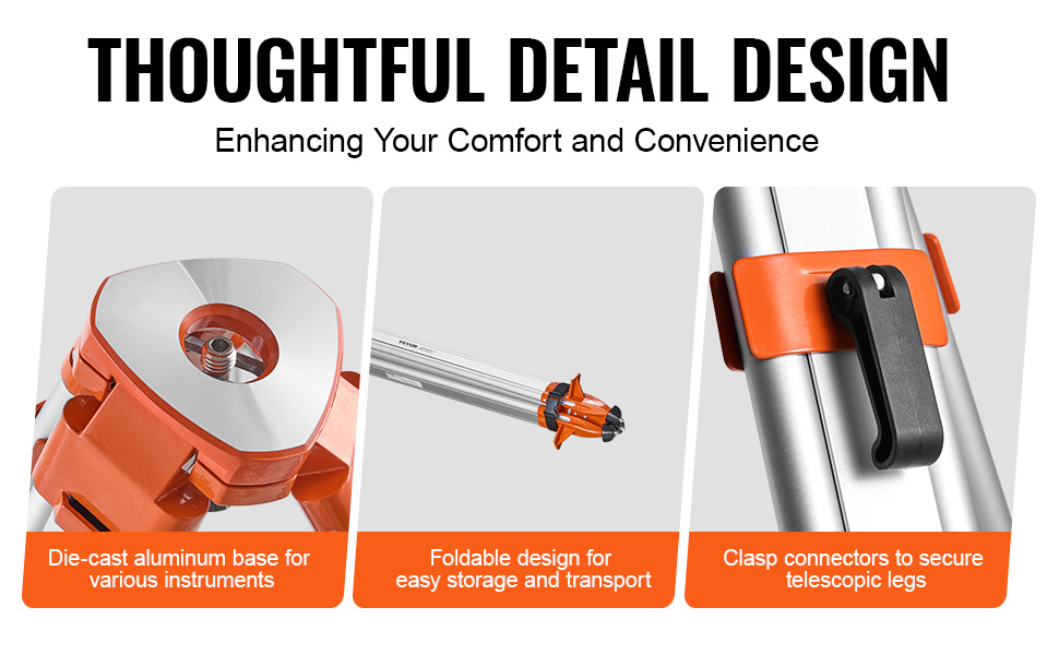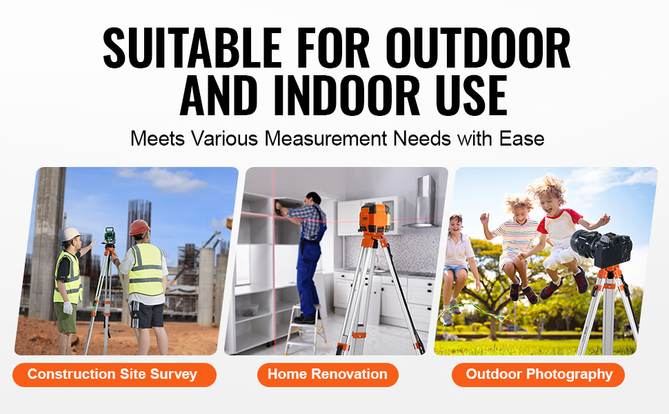 The VEVOR tripod is made from premium aluminum, making it sturdy and durable for long-term use without wear. Height is adjustable to meet various measurement needs. Compatible with line lasers, point lasers, and laser distance meters, widely used in construction, and interior decoration.