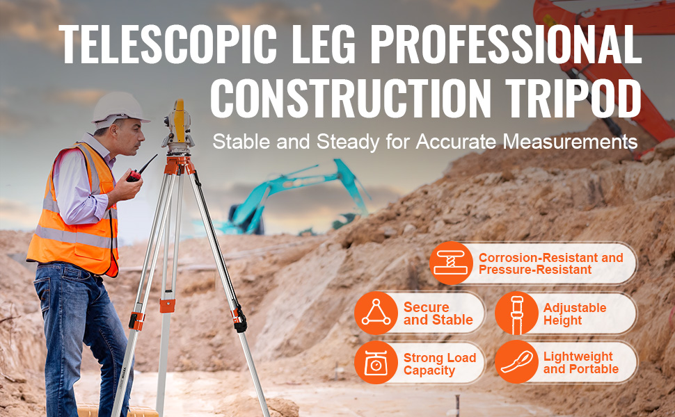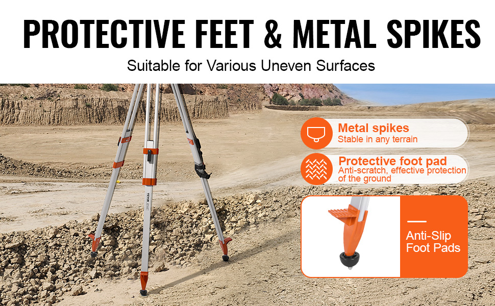 - Durable and Sturdy: The VEVOR tripod is constructed from 0.03''/0.8mm aluminum alloy, ensuring long-lasting durability and resistance to wear. The die-cast aluminum base supports heavy-duty instruments like total stations, with a maximum load capacity of 12lbs/5.44kg.