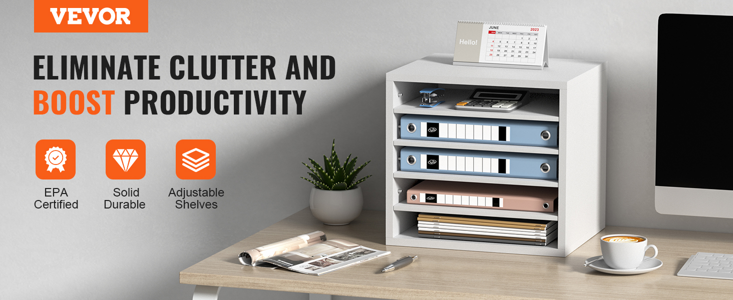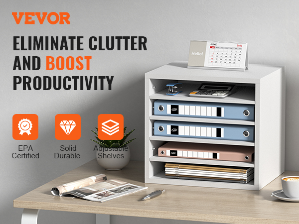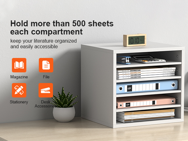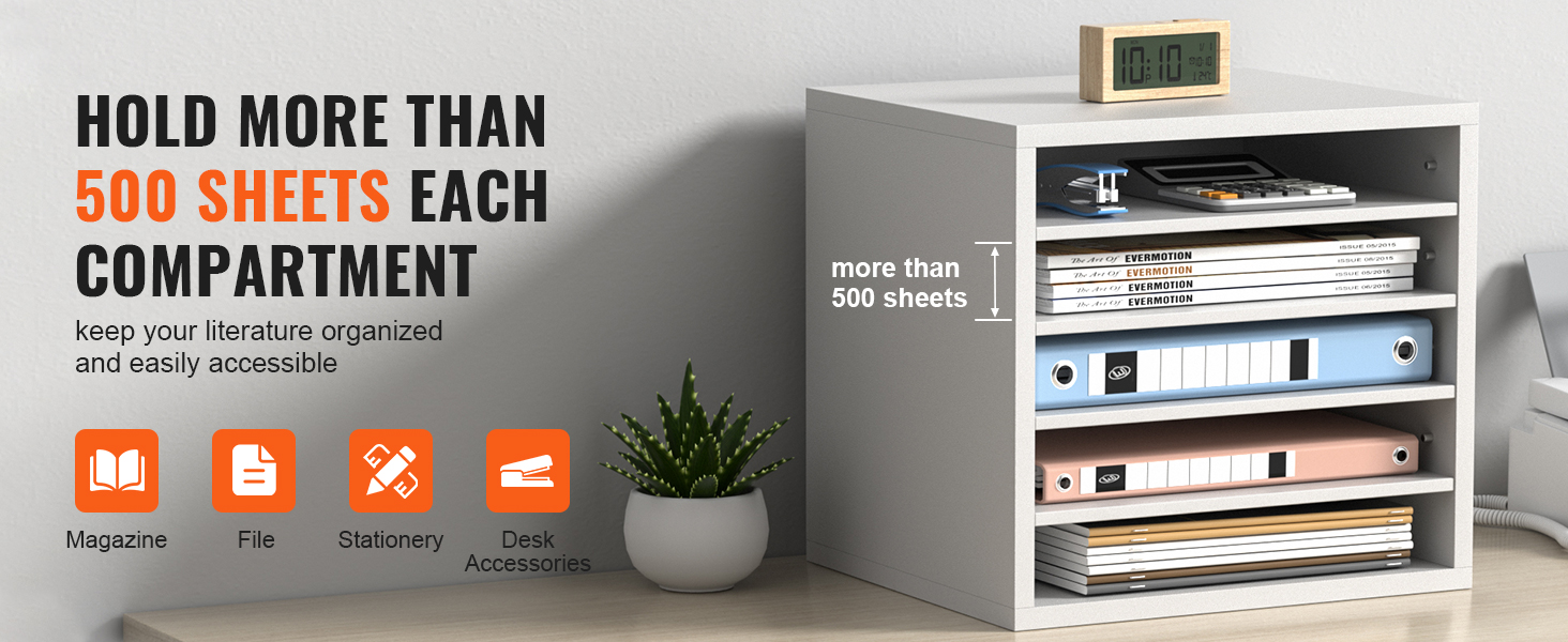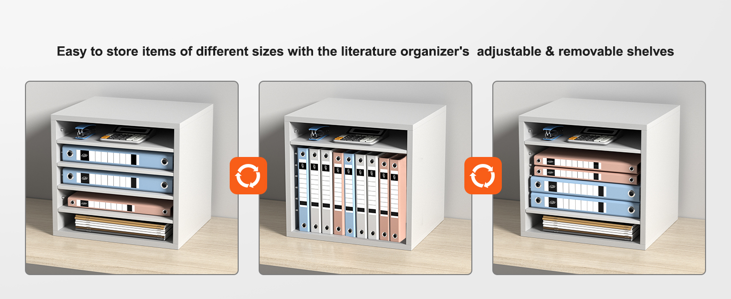 VEVOR’s 5-compartment literature organizer keeps your literature, files, and forms organized and easily accessible. Each compartment provides ample space to store your papers, and the removable shelves can be adjusted to create taller compartments for larger binders. Tidy up your space with VEVOR.