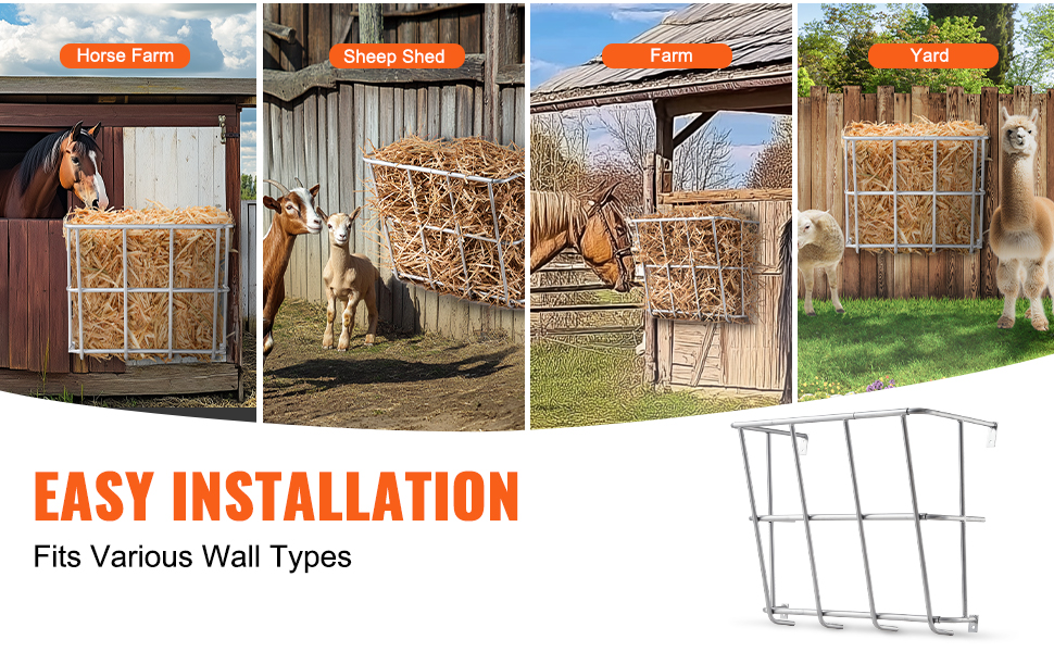 - Wall-mounted design: This wall mounted livestock hay holder saves space on the ground. The wide-opening multi-feeding rack can accommodate 5 horses feeding at the same time.