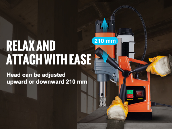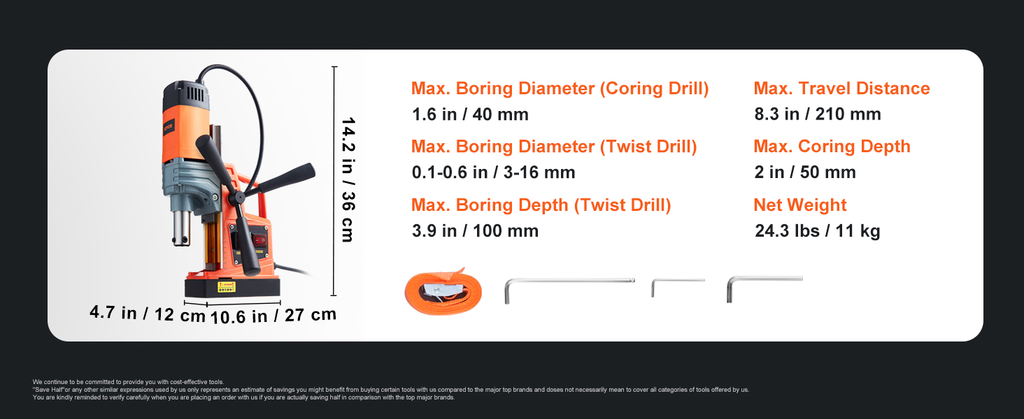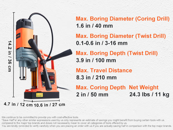 - Top-level Magnet: Get ready for unstoppable power! Our electric mag drill generates exceptionally powerful driving force with its 1300W copper motor. It is capable of drilling into the toughest material at 810 RPM. Max. Boring Diameter (Coring Drill): Φ1.6 in / Φ40 mm; Max. Coring Depth: 2 in / 50 mm