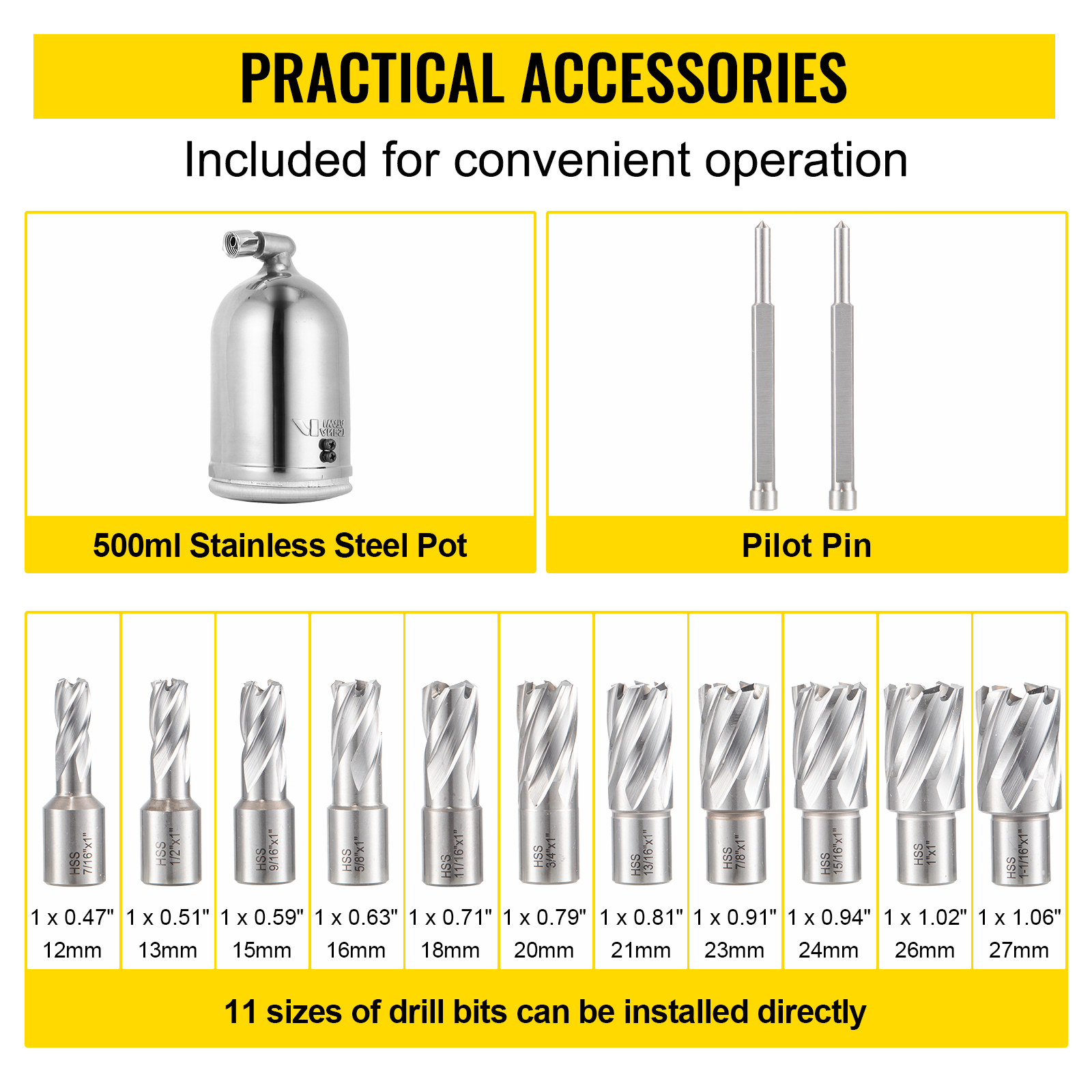 - 11 x HSS Annular Drill Bits(0.47″ x 1″/12mm x 26mm, 0.51″ x 1″/13mm x 26mm, 0.59″ x 1″/15mm x 26mm, 0.63″ x 1″/16mm x 26mm, 0.71″ x 1″/18mm x 26mm, 0.79″ x 1″/20mm x 26mm, 0.81″ x 1″/21mm x 26mm, 0.91″ x 1″/23mm x 26mm, 0.94″ x 1″/24mm x 26mm, 1.02″ x 1″/26mm x 26mm, 1.06″ x 1″/27mm x 26mm)