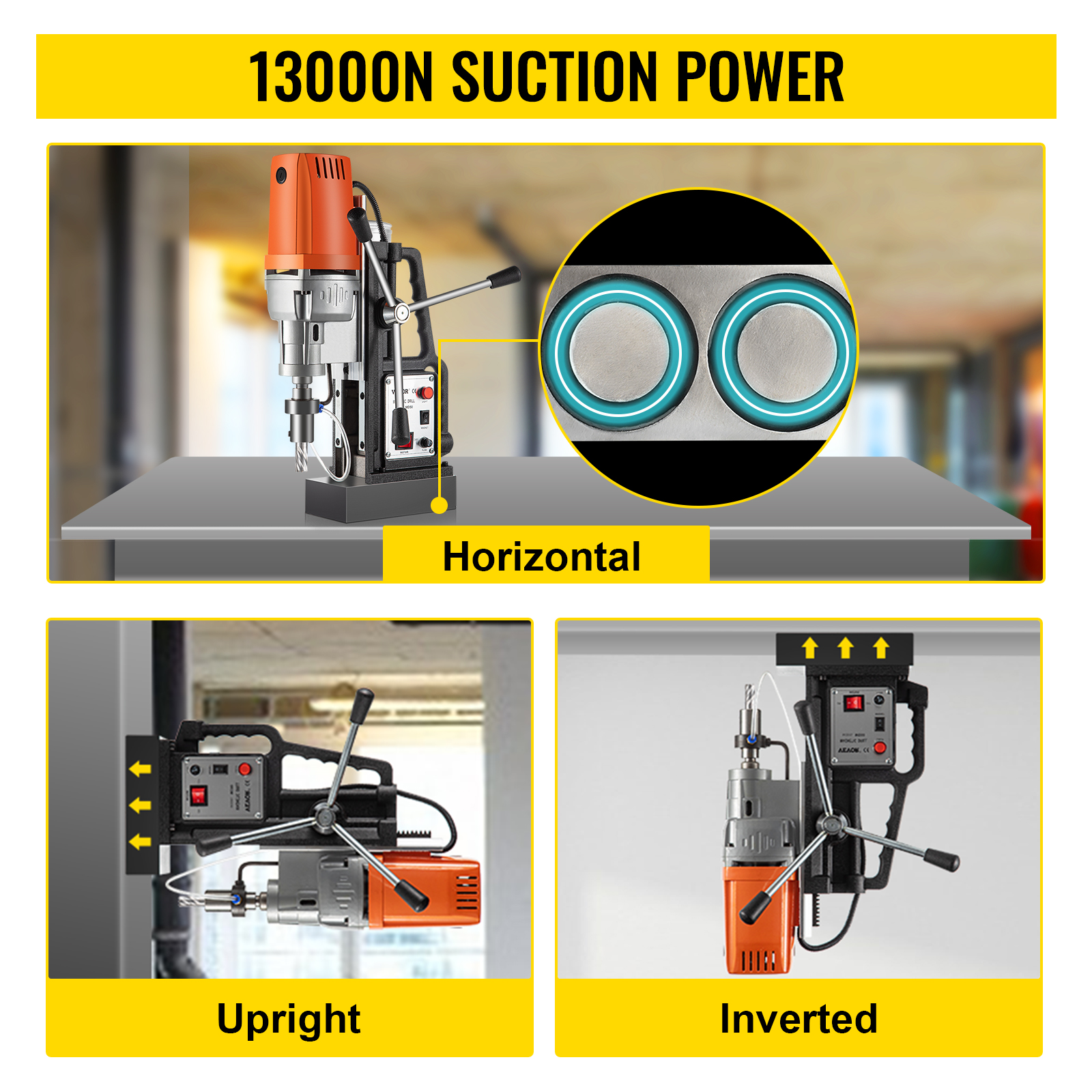 - 13,000N Magnetic Force: The powerful two-stage magnet generates 13,000 N of holding force, ensuring the drill press remains stationary during operation. Thanks to its electromagnet base, the magnetic drill press anchors itself securely via its solid iron base.