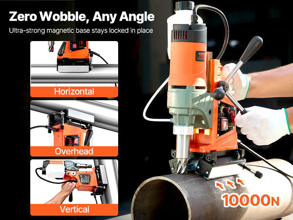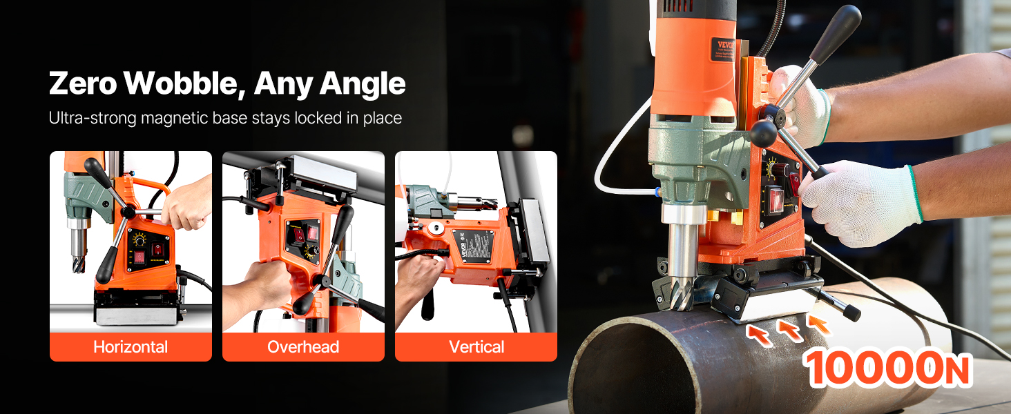 - Stable Magnetic Base: With a 1000 N magnetic base and no-shake strap, this mag drill press attaches securely to flat steel and curved pipes (Ø3.15-11.81 in), supporting upright, side, and overhead drilling with a strong holding force for stable use