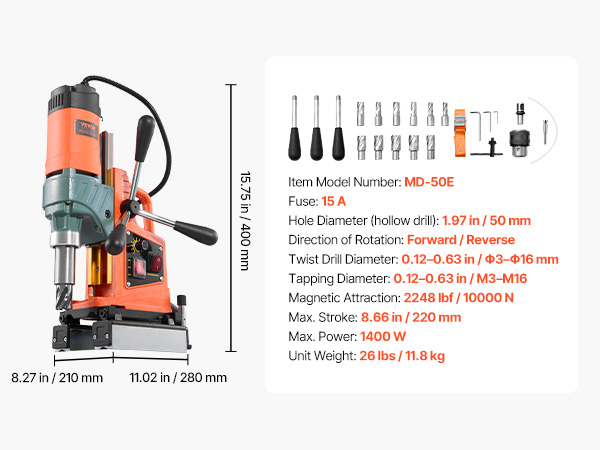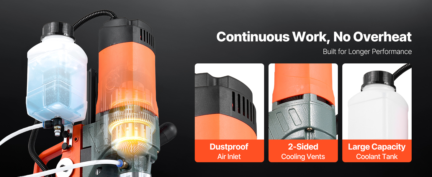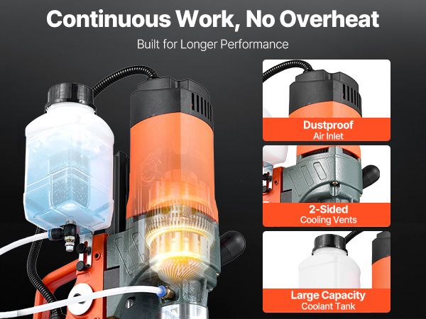 - Dual Protection: Built-in cooling and lubrication keep the magnet drill press bits and surfaces at optimal temp during long use. A 15A overload fuse avoids motor damage from misuse, extending lifespan and ensuring secure heavy-duty operation