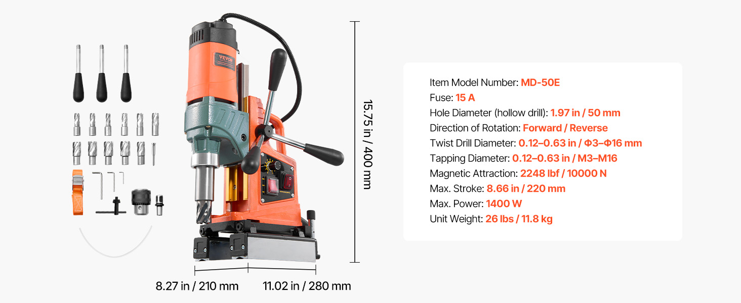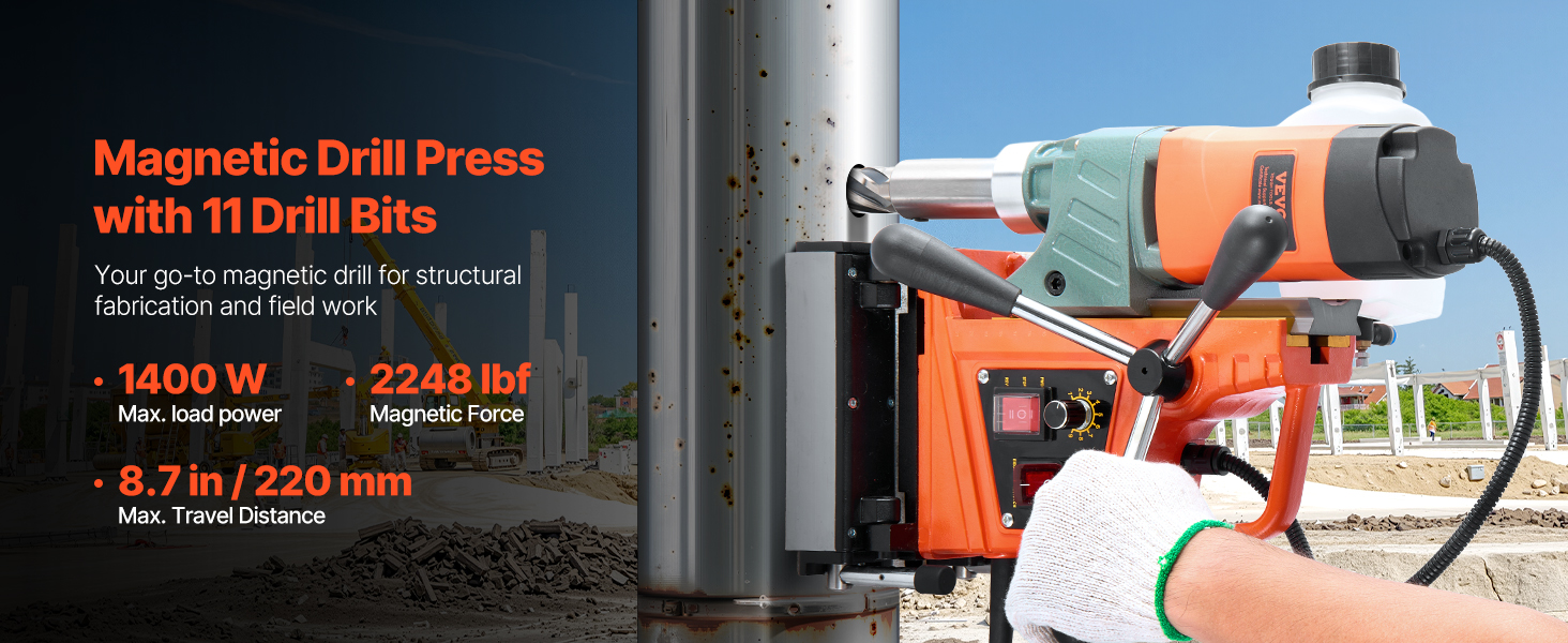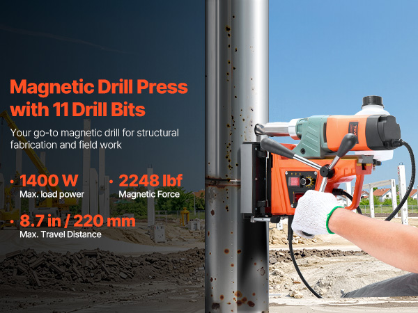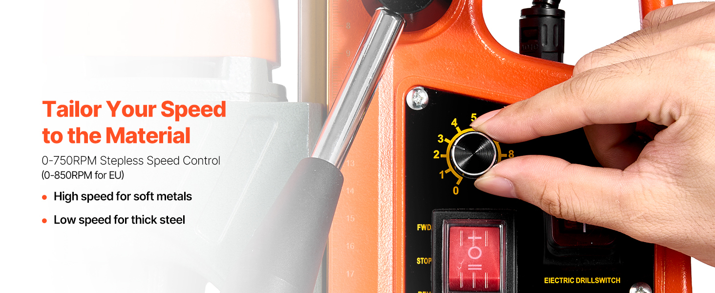 - Precision Speed & Extended Travel: 10-level speed dial suits materials from soft metals to hardened steel, ensuring optimal cutting and less bit wear. The magnet drill features an 8.66 in stroke and clear scale for consistent, accurate drilling