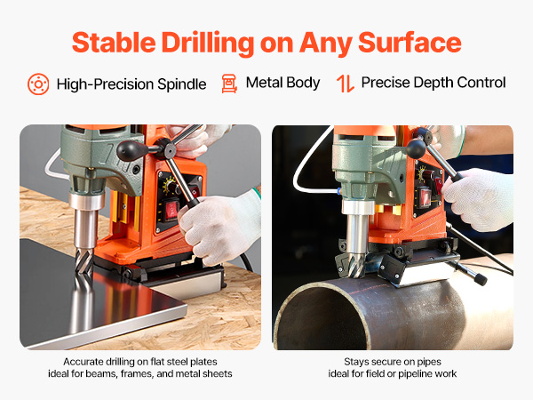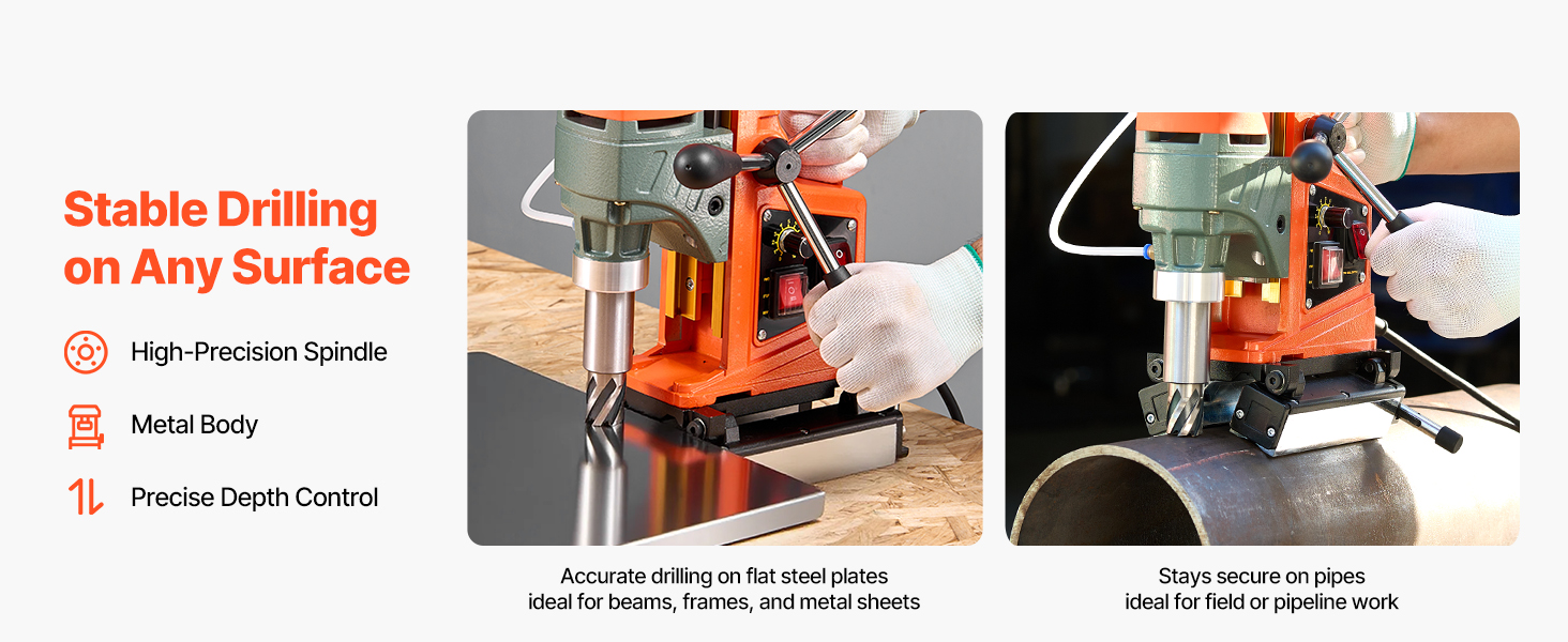 - Stable Magnetic Base: With a 1000 N magnetic base and no-shake strap, this mag drill press attaches securely to flat steel and curved pipes (Ø3.15-11.81 in), supporting upright, side, and overhead drilling with a strong holding force for stable use