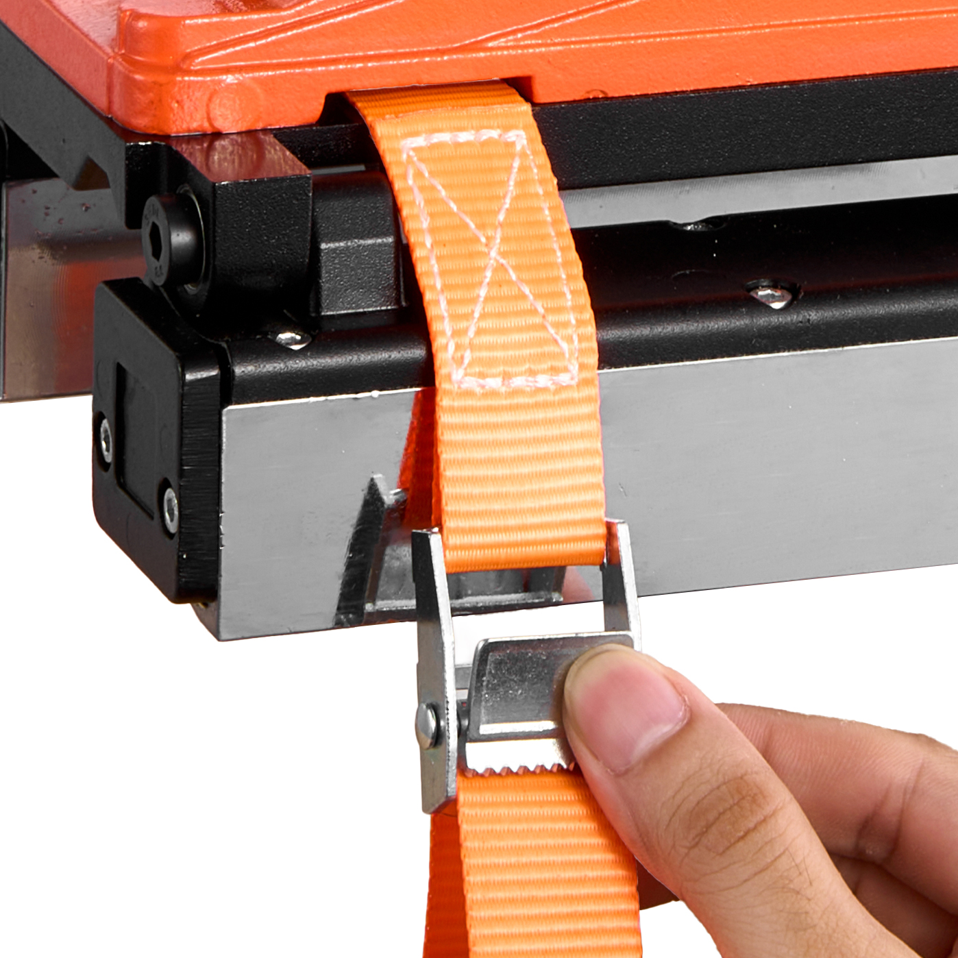 The no-shake strap secures the magnet drill to the metal surface, enhancing operational stability.