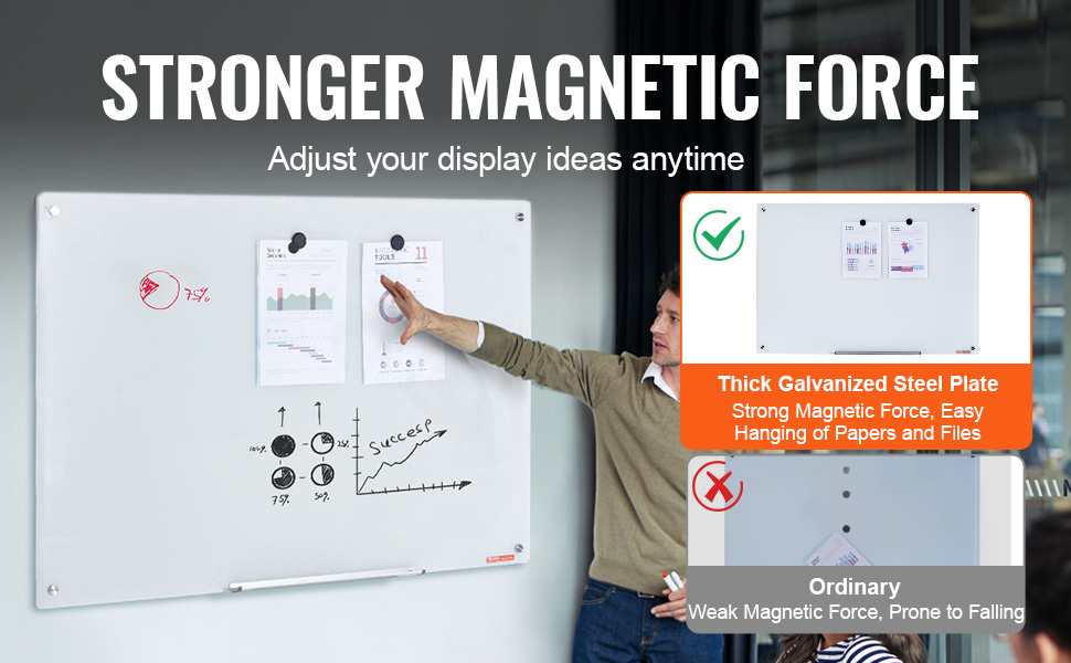 - Strong Adhesion: Equipped with a 0.4mm thick galvanized sheet for enhanced magnetic force, making our magnetic glass dry erase board easy to hang papers and documents. Whether for presentations or training, focus on content without worrying about its stability.
