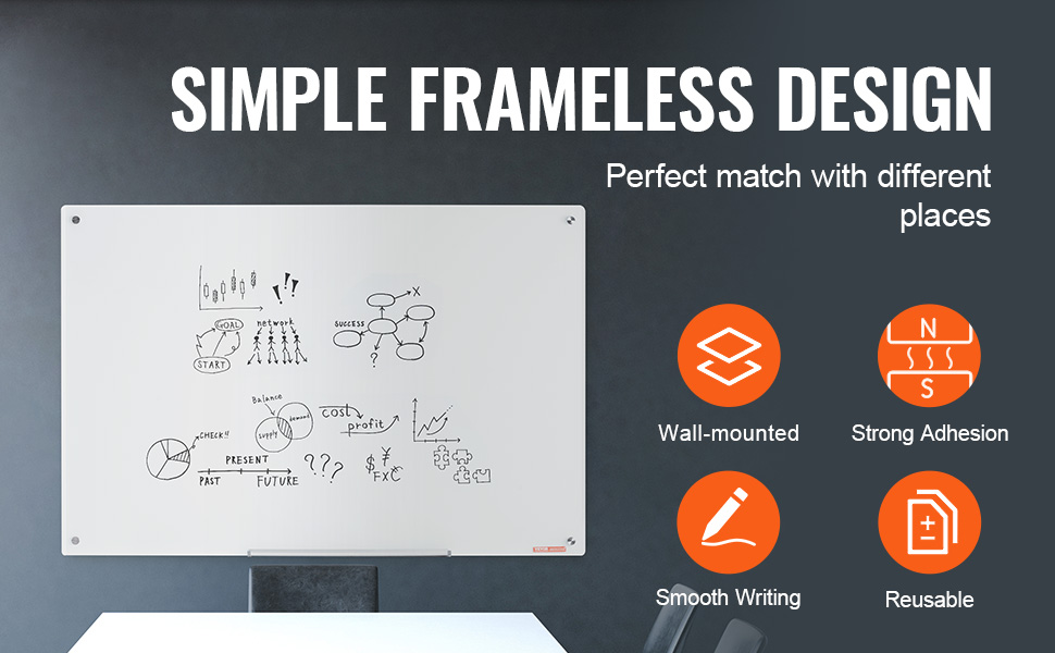 Crafted from tempered glass, resistant to breakage, scratches, and stains. The 0.4mm thick galvanized sheet for enhanced magnetic strength, allowing easy hanging of papers and files for presentations. Its sleek frameless design adds a unique focal point to your space!