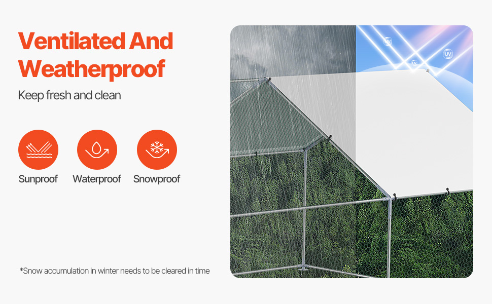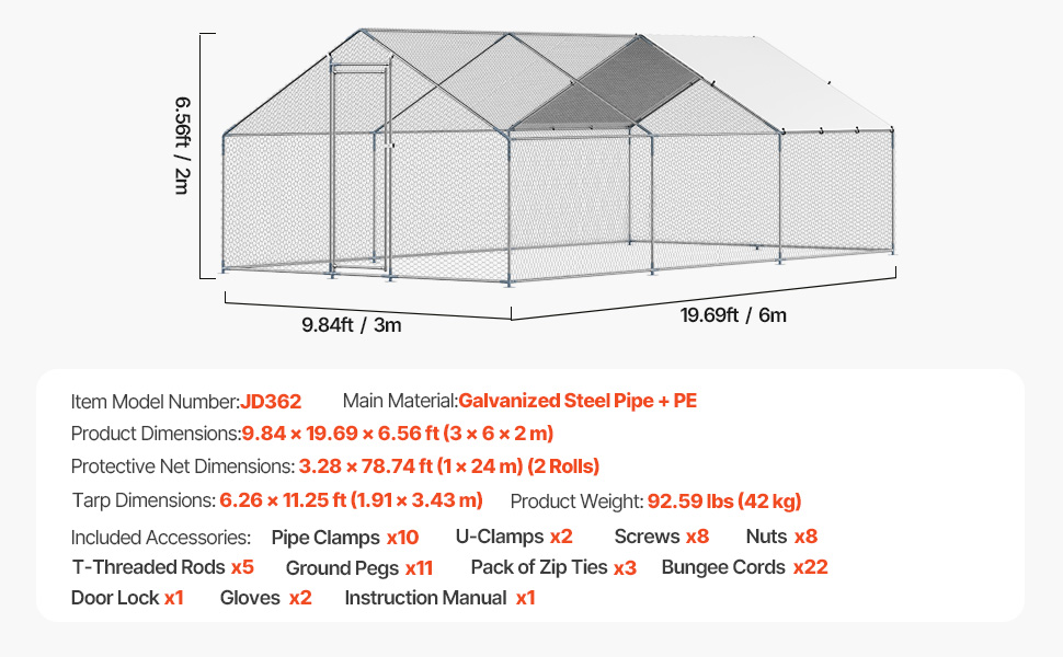 - Spacious Living Area: Offering a generous 9.8×19.6×6.5 ft of space, this metal chicken run features four-sided ventilation, creating a healthy and comfortable environment. The PE-coated canopy provides sun protection, waterproofing, and tear resistance, shielding your poultry from external elements.