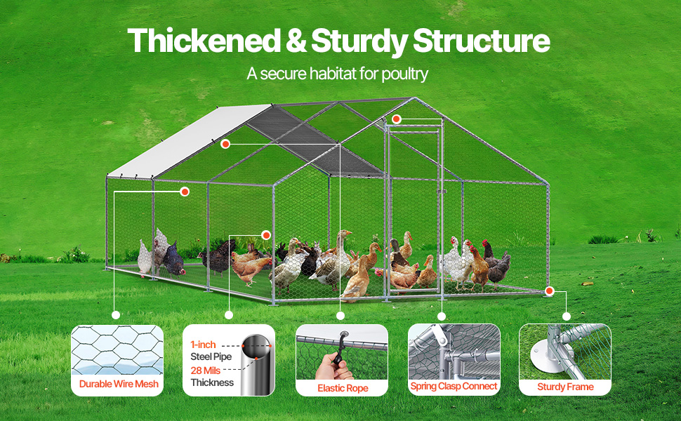 - Sturdy Structure: With 1" thick galvanized steel pipes and precise welding, this chicken house boasts stability and wind resistance. The top cover facilitates effective drainage, preventing water accumulation. Reinforced with hexagonal protective mesh, it provides a securer space for the poultry.