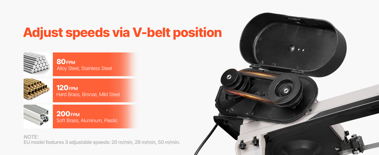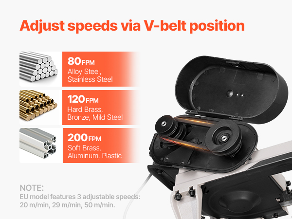 - Versatile Material Compatibility: Equipped with three adjustable speeds—80 FPM, 120 FPM, and 200 FPM—this metal cutting band saw adapts to various materials, including steel, aluminum, brass, wood, and plastics. You can adjust the V-belt position on the pulley to match material thickness and type for optimal results