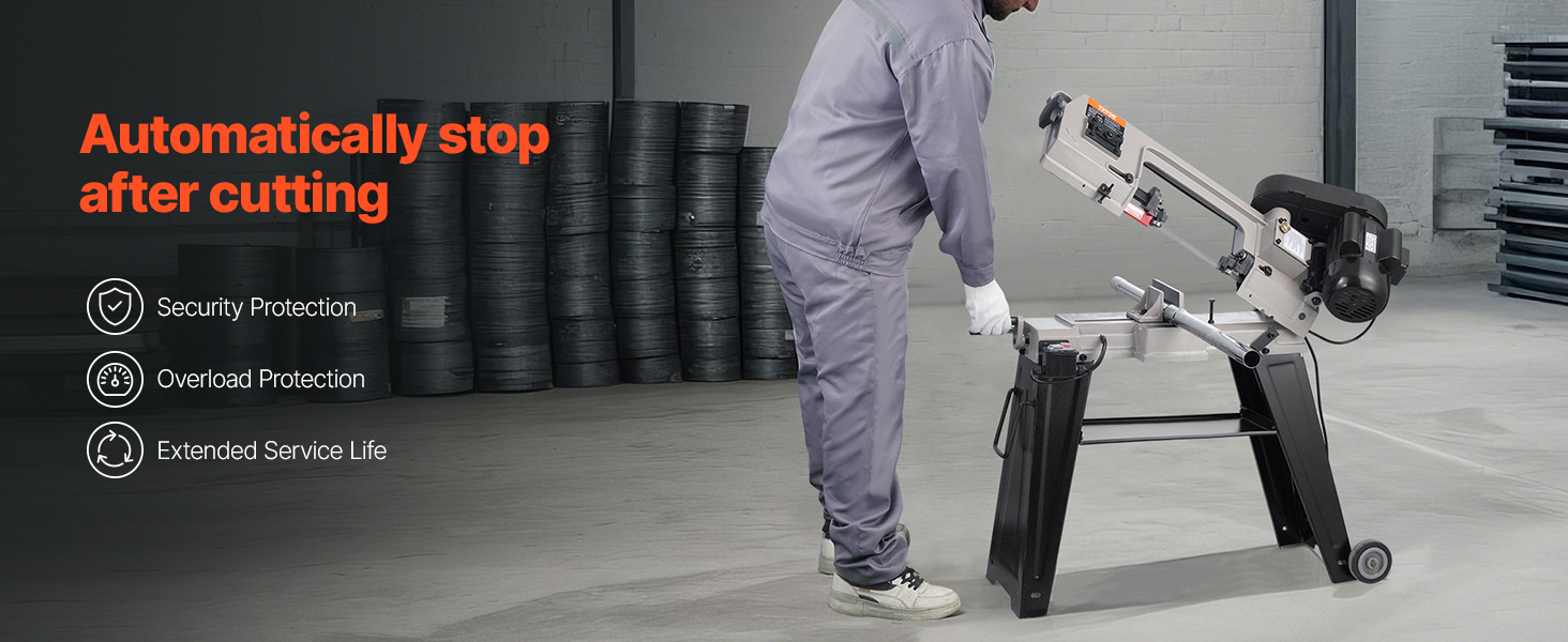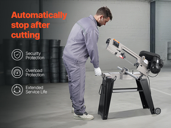 - Automatic Shut-Off for Security: The horizontal band saw's gravity feed cutting system reduces manual effort for more convenient cuts. It automatically shuts off after completing cuts, avoiding motor overrun and extending the machine's service life. Additional features include a chip guard to minimize mess and an emergency stop button for enhanced security