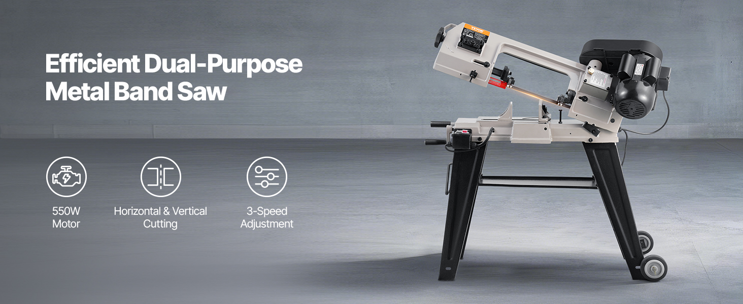 Our 550W metal band saw has 3 speeds (80, 120, 200 FPM), cutting multiple metal materials, wood, and plastic with ease. It handles horizontal, vertical, and 0°-45° cuts with a 4 x 6 in capacity. Quick-lock vise and gravity feed ensure smooth edges, plus wheels for mobile convenience.