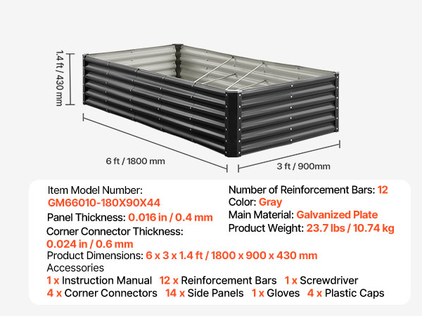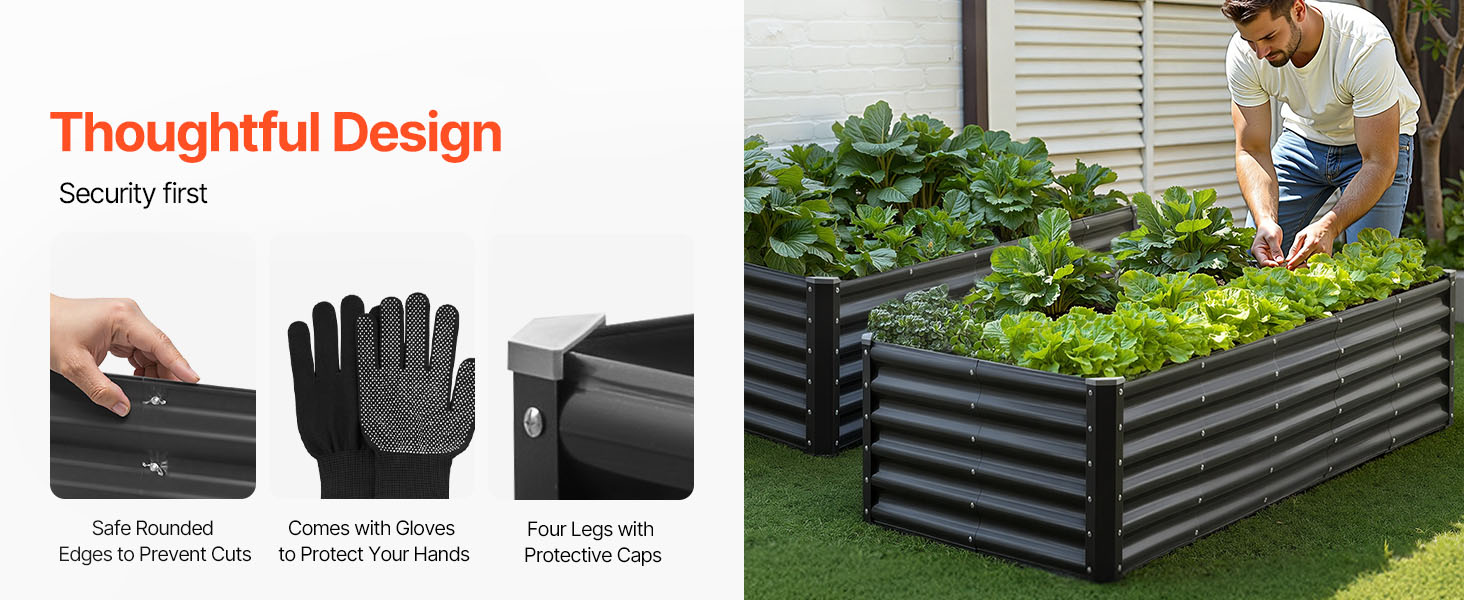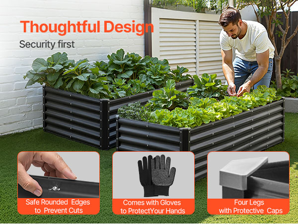 The raised bed features rolled edges and smoothly rounded corners for added security. Each of the four legs comes with protective caps, and we include gloves to help keep your hands from scratches.