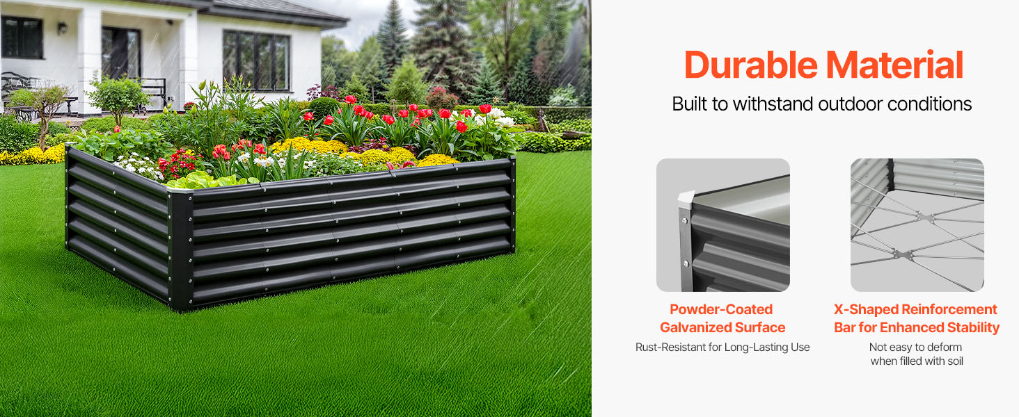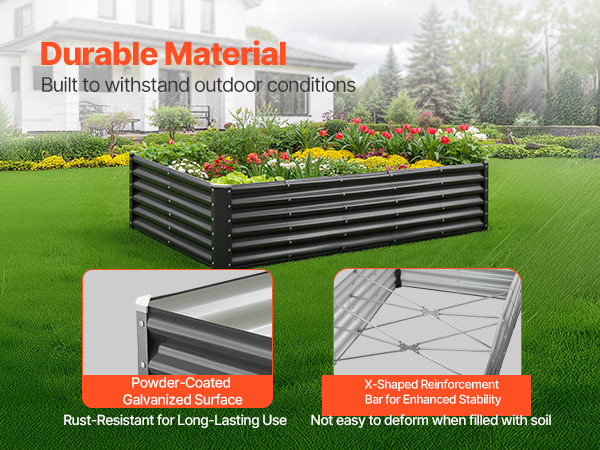 - Sturdy and Reliable: Constructed with 0.4 mm metal side panels and 0.7 mm corner connectors, this metal raised garden bed features a galvanized powder-coated surface for rust resistance. The 12 internal X-shaped bars enhance structural stability and prevent toppling in high winds.