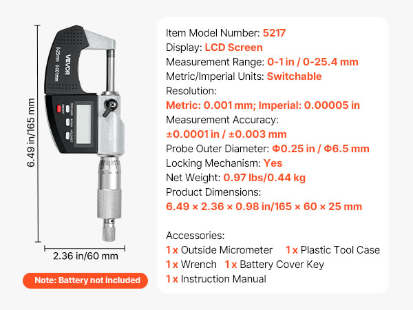 - Complete Set Included: This digital micrometer includes a dedicated hard case with 1 micrometer, wrench, battery cap key, and instructions. Keeps tools organized, easy to carry, and ready for accurate measurements anytime.