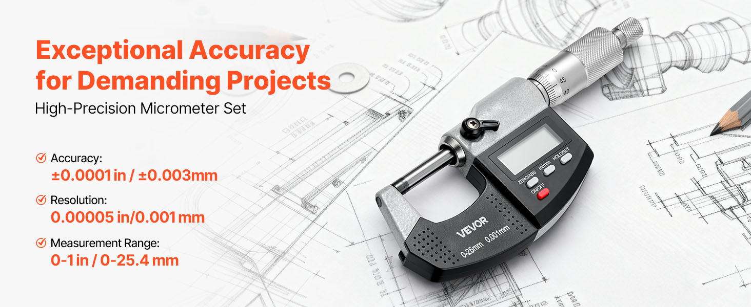 - High-Precision Micrometer Set: Offers 0-1 in / 0-25.4 mm range, ±0.0001 in / ±0.003 mm accuracy, and 0.00005 in / 0.001 mm resolution. Whether checking engine parts or fine components, this micrometer ensures consistent, reliable measurements every time.