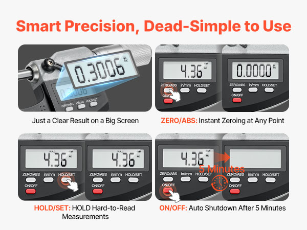 - Smart & Easy Operation: This micrometer set features a large LCD for clear readings, quick inch/mm switch, and data hold to lock values in tight spots. A 5-minute auto-off function avoids power waste, making precision measurement easier.