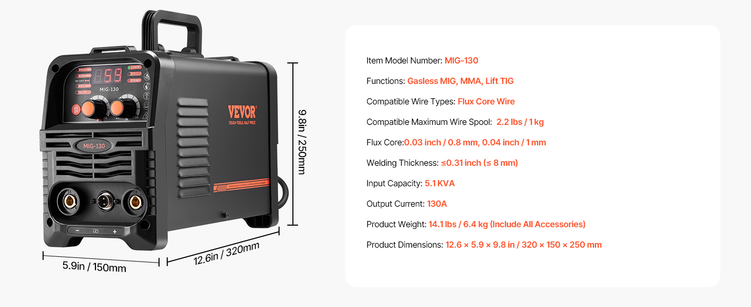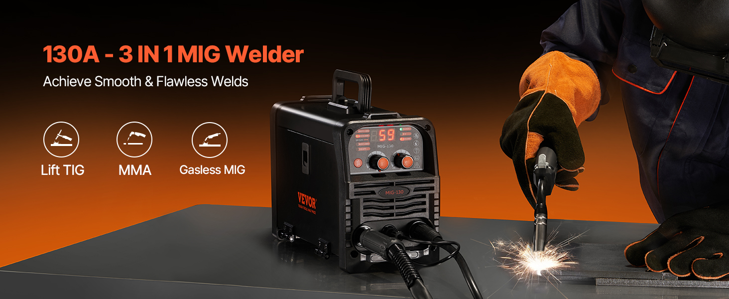 - 3-in-1 MIG Welder: This 130Amp 3-in-1 mig welder supports multiple welding functions – lift TIG, gas flux core MIG, and MMA welding. Versatile and efficient, it easily handles various materials and welding scenarios, providing a convenient and high-performance solution for your welding tasks. (Note: Lift TlG Torch is not included)