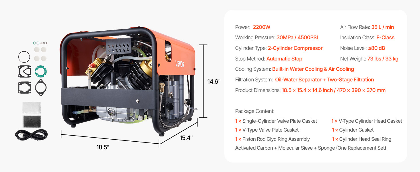- Enhanced Efficiency: This VEVOR PCP air compressor adopts a dual-cylinder two-stage compression design, with 4500 PSI / 30Mpa maximum pressure and 2200W high power, delivering 35 L / min high air flow rate. It takes about 3 minutes to fill a 0.5L tank from 0 to 4500PSI and 45 minutes to fill a 6.8L tank from 0 to 4500PSI