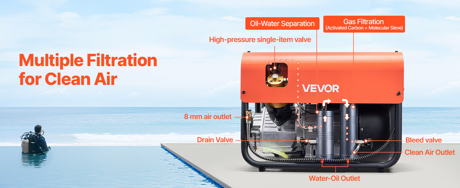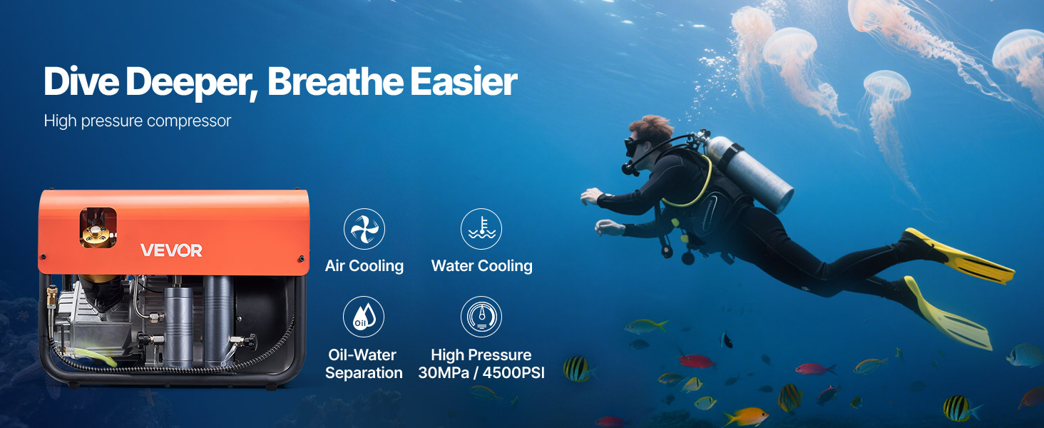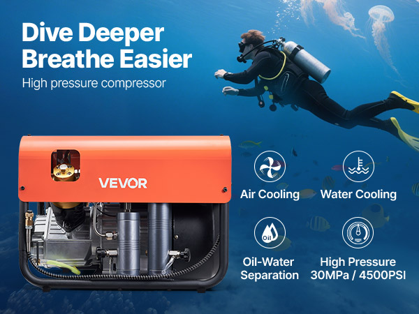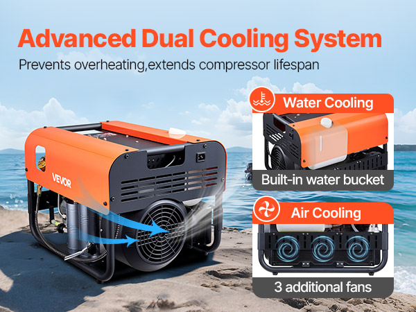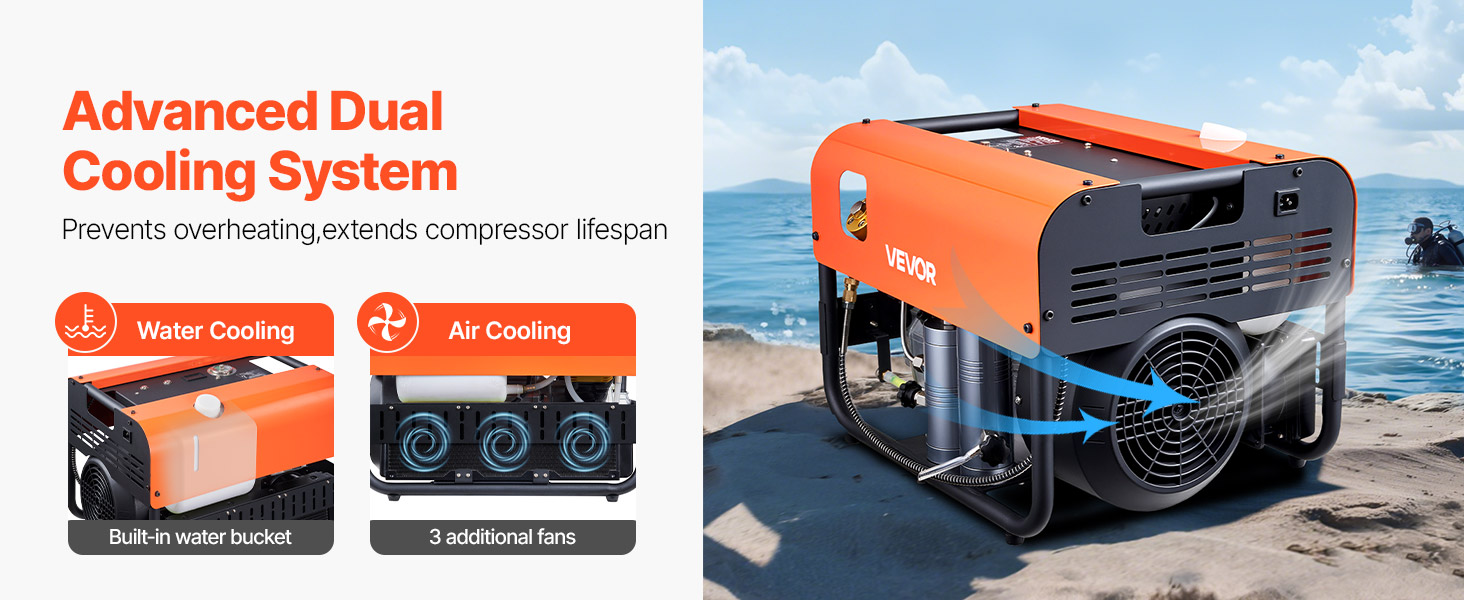 This VEVOR dual-cylinder diving scuba tank air compressor features 2200W high power and 4500PSI (30MPa) maximum pressure, delivering 35 L/min high air flow rate. Its built-in water and fan cooling system ensures efficient heat dissipation, preventing overheating and ensuring safety.