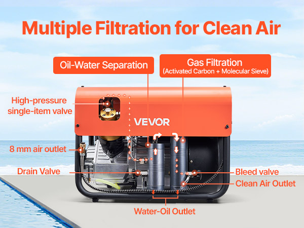 - Multi-Layer Filtration System: Equipped with an oil-water separator and gas filtration system (Activated Carbon + Molecular Sieve), this PCP diving compressor pump effectively removes moisture, oil, and impurities, ensuring the delivery of clean, dry, and high-quality air