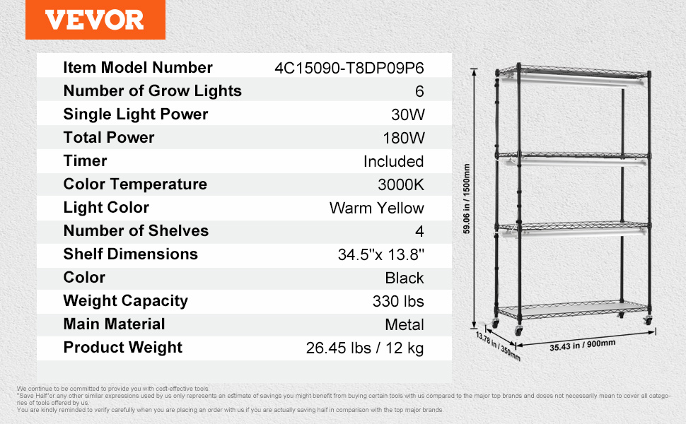 This 180W plant rack features 6 LED light panels with a 400-780nm full spectrum for all plant growth stages. Made from high-density steel, it offers rust and oxidation resistance. Measuring 35.43 x 13.78 x 59.06 in, the 4 shelves supports a total weight of 330 lbs for display of various plants.